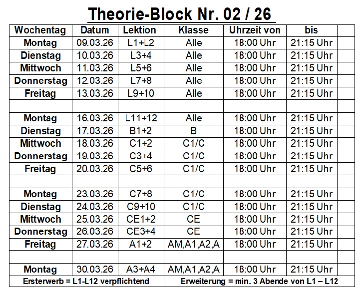 Nächster Blockunterricht ab dem 09.03.2026 (18:00-21:15 Uhr)